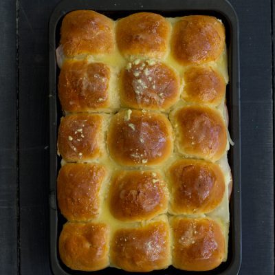 Halkaise sämpylät ja nosta pohjat takaisin samaan vuokaan, jossa valmistit Hawaiian rollsit. Lado pohjien päälle kinkkuleikkeet, juustosiivut ja suolakurkut.