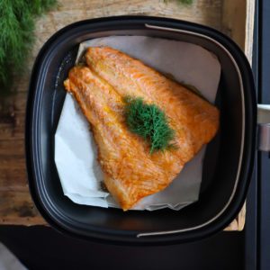 Esilämmitä airfryeria vähintään 3 minuuttia. Huuhtele lohen pala kylmällä vedellä ja taputtele se kuivaksi.