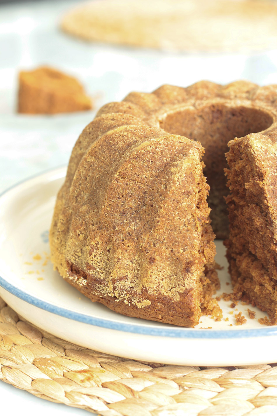 Kaada taikinaa voideltuun, korppujauhotettuun n. 2.4 l vuokaan korkeintaan 3/4 korkeudelle, sillä kakku kohoaa paljon. Paista loppu taikina toisessa vuoassa tai astiassa, jollei vuoka ole riittävän suuri.