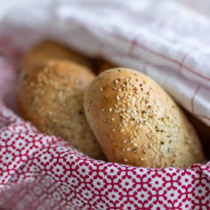 Voitele sämpylät maidolla ja ripottele päälle hampun- ja seesaminsiemeniä.