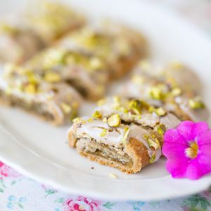 Kun leivonnaiset ovat jäähtyneet hieman, levitä päälle kuorrutus ja ripottele päälle pistaasipähkinöitä.