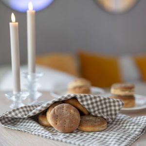 Kauli taikina noin 1 cm paksuiseksi levyksi ja leikkaa siitä noin 15 cm halkaisijaltaan olevia pyörylöitä. Voit käyttää apuna sopivan kokoista juomalasia.