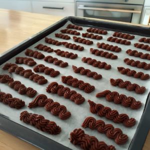 Täytä pursotinpussi isolla tähtiporsottimella. Pursota noin 5 cm pitkiä aaltoilevia nauhoja leivinpaperilla vuoratulle uunipellille.