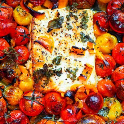 Nosta fetajuusto tomaattien ja paprikan pinnalle.