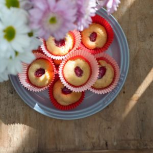 Paina pallojen keskelle pieni kolo ja laita jokaiseen nokare vadelmamarmeladia.
